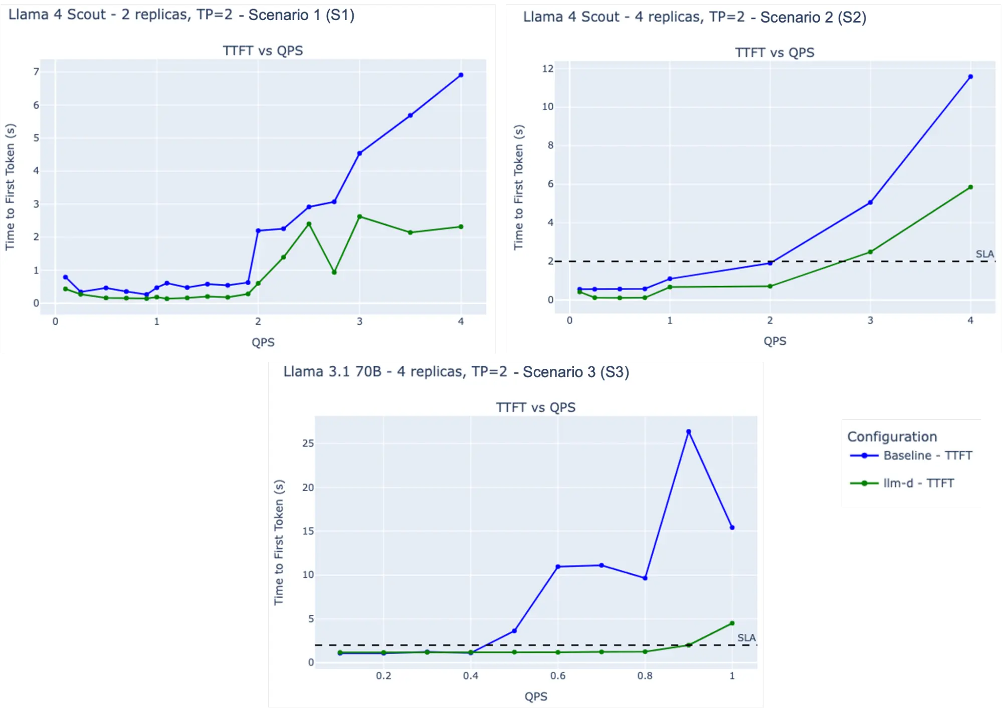These results show that llm-d's cache- and prefix-aware scheduling effectively reduces TTFT and increases QPS compared to the baseline, while consistently meeting SLA requirements.